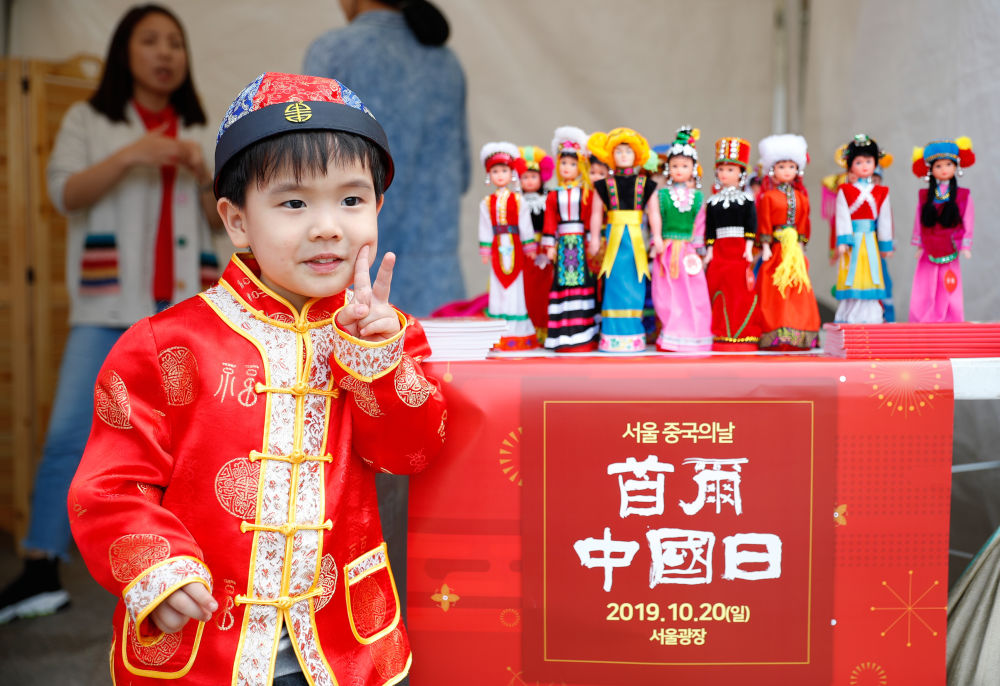 2019年10月20日,在韩国首尔,一名儿童在第七届“首尔·中国日”活动现场拍照。(新华社记者王婧嫱摄)