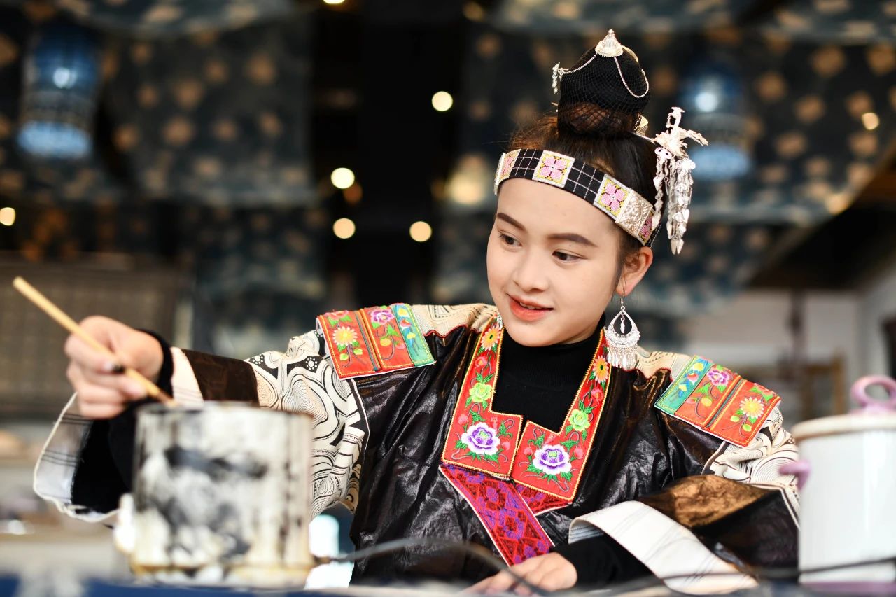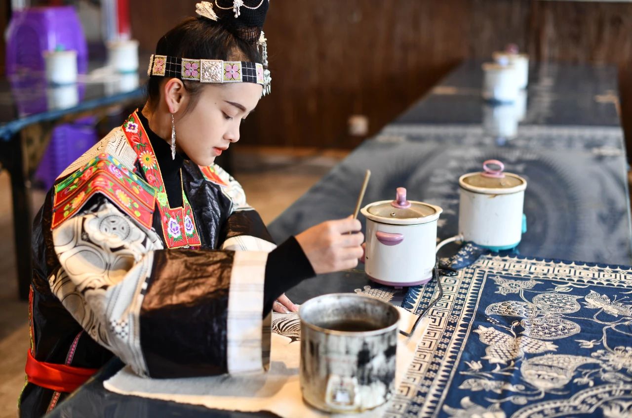 逶迤的群山、古朴的苗寨……苗族“染娘”王欣颖就出生在这里。这里是贵州省黔东南苗族侗族自治州丹寨县扬武镇排倒村。6岁起,王欣颖便开始跟随母亲学习蜡染,心灵手巧的她从此深深爱上这门祖传的老手艺。