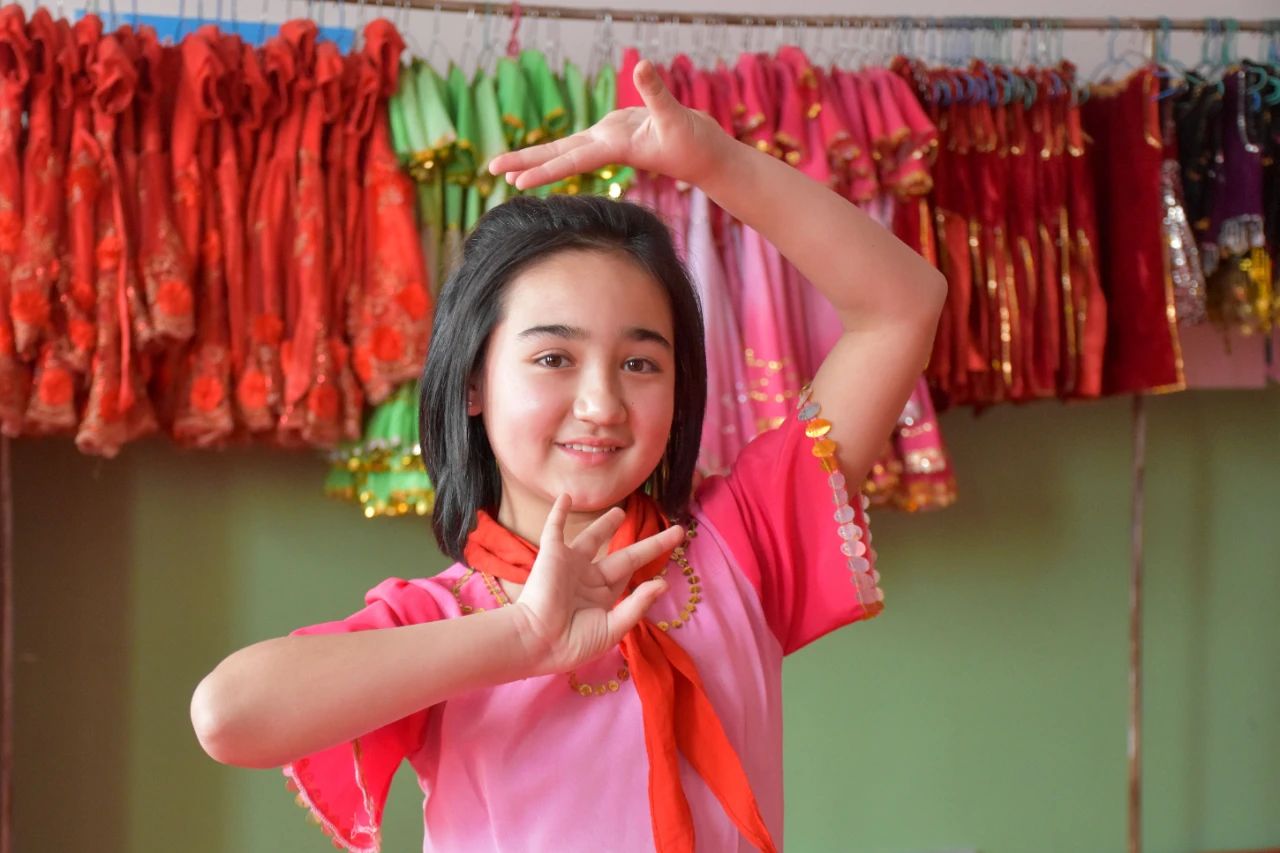 11岁的维吾尔族小姑娘帕提麦·阿力木,是新疆维吾尔自治区喀什地区英吉沙县第三小学五年级学生。2017年,第三小学建成现代化教学楼,帕提麦·阿力木和她的小伙伴们拥有了练习跳舞、唱歌、书法等才艺的专用练习室,学校统一配备了80余套用于演出的民族服饰。层出不穷的兴趣社团和比赛,让这里的孩子终于有机会去施展才艺。