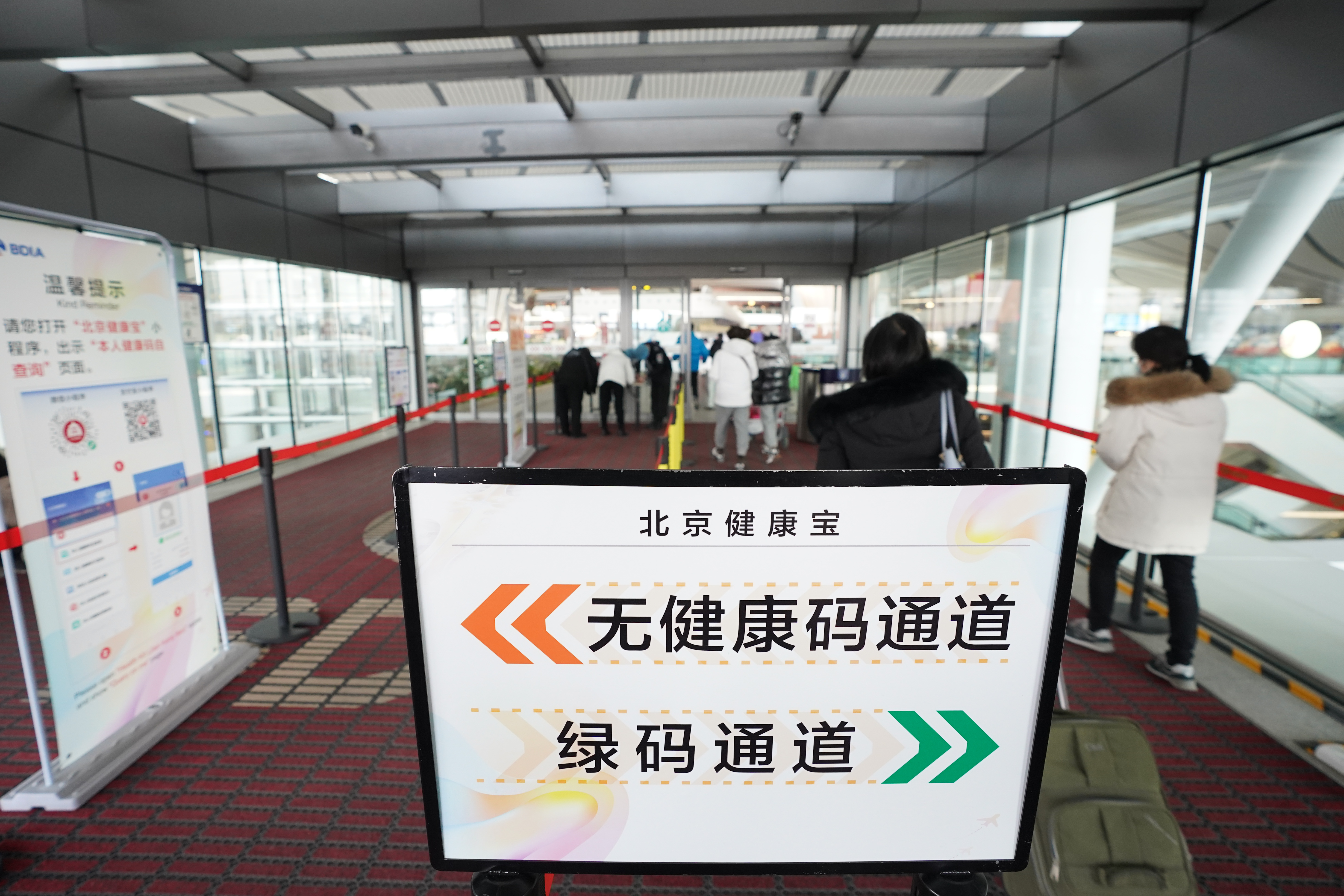 12月9日在北京大兴国际机场出发大厅四层4号门入口拍摄的“绿码通道”和“无健康码”通道。