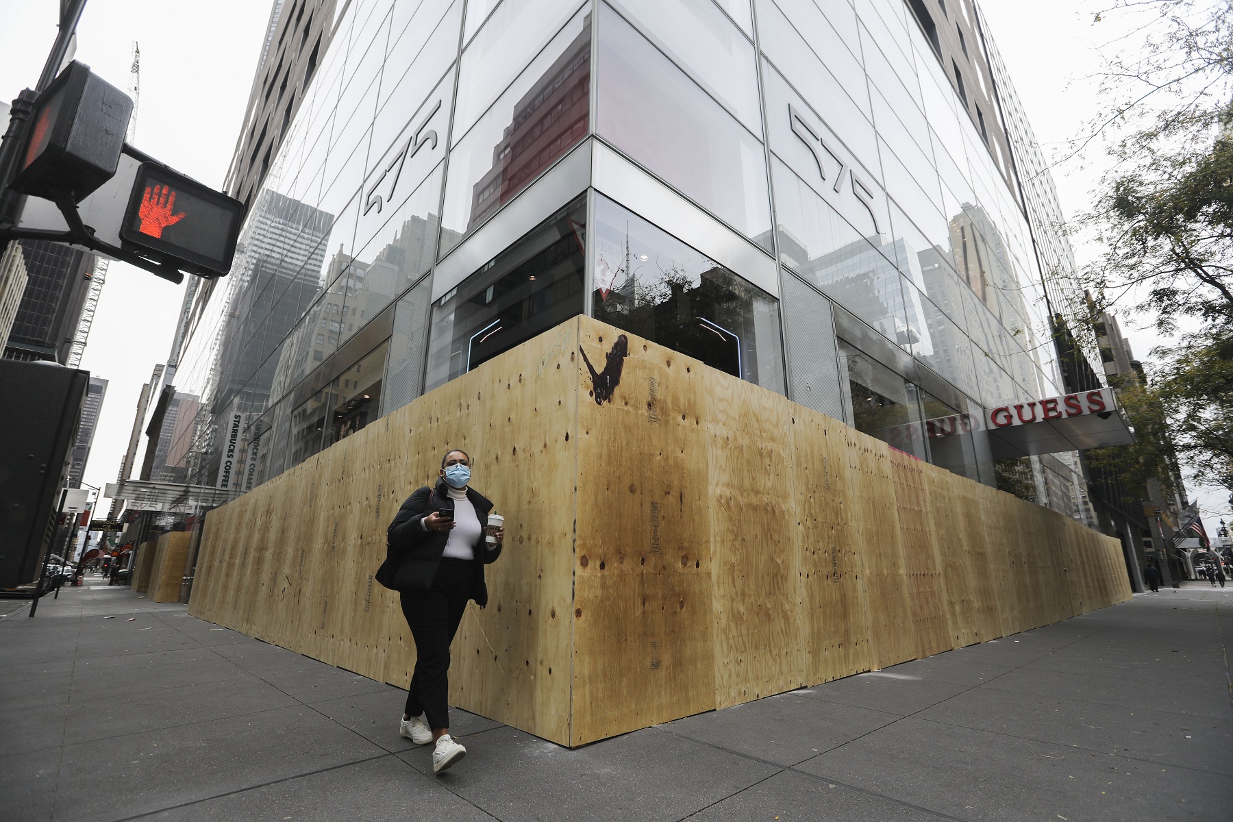 2020年11月1日,在美国纽约第五大道,一名女子从一家安装了防护板的商店旁走过。(新华社记者王迎摄)