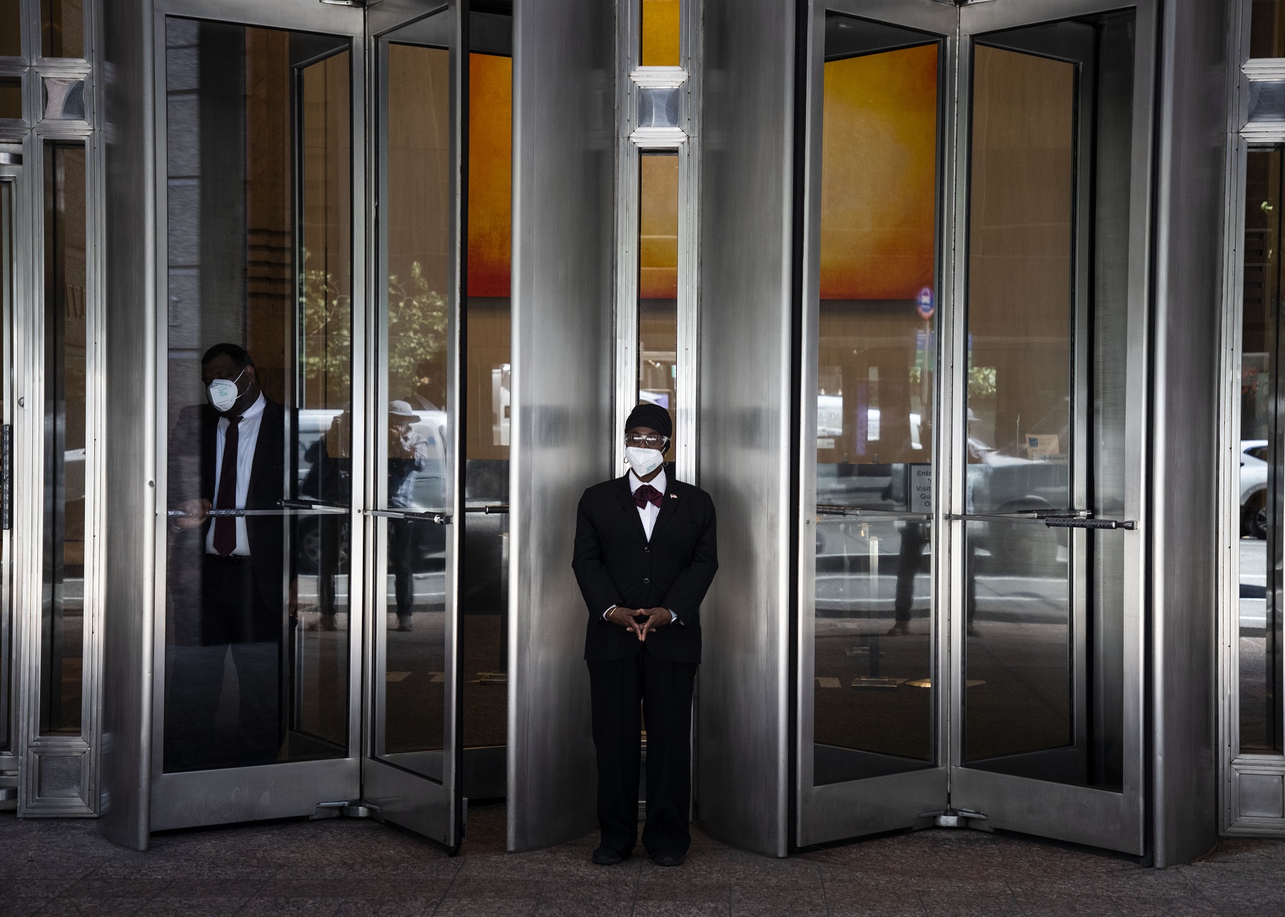 2020年9月28日,在美国纽约,一名门卫在写字楼外值班。(新华社记者王迎 摄)