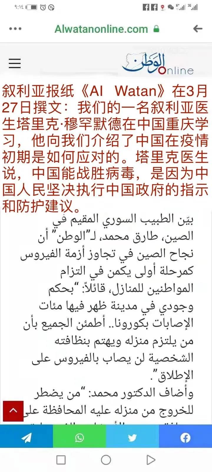 塔里克还整理了在校期间亲眼目睹的中国政府疫情防控工作开展情况,及时联系叙利亚国内记者,告知中国抗击疫情真实进展。叙利亚著名报纸《Al Watan》对此进行了报道,不少当地民众被中国的抗疫决心和意志而震撼。