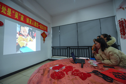 1月26日,浙江省湖州市吴兴区东林镇一家纺织企业员工在迎新春活动现场与家乡的孩子视频连线。新华社记者徐昱摄