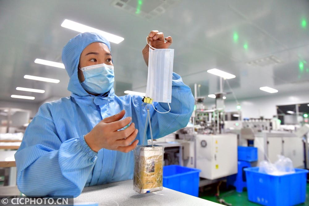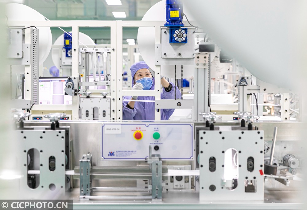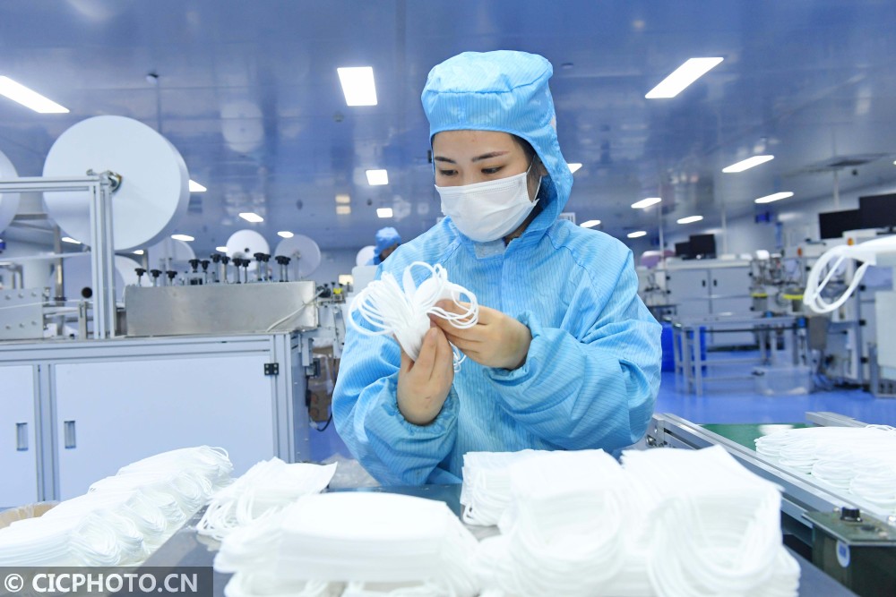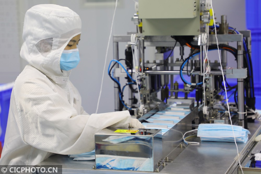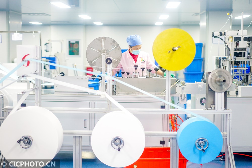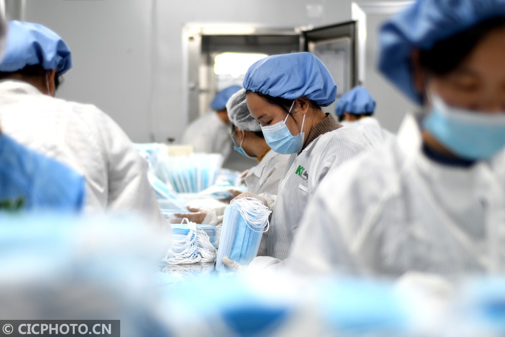 ↑2021年1月28日,在湖南省湘西土家族苗族自治州吉首市湘西高新技术产业开发区一家防疫物资生产企业车间,工人在生产医用口罩。CICPHOTO/刘振军 摄