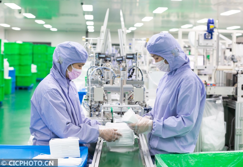 ↑2021年1月27日,江苏海安高新区的某医用材料有限公司十万级净化车间内,工人们在赶制出口日本的一次性医用口罩。CICPHOTO/翟慧勇 摄