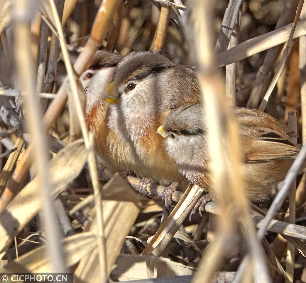 ↑三只震旦鸦雀在芦苇里小憩。CICPHOTO/王希宝 摄