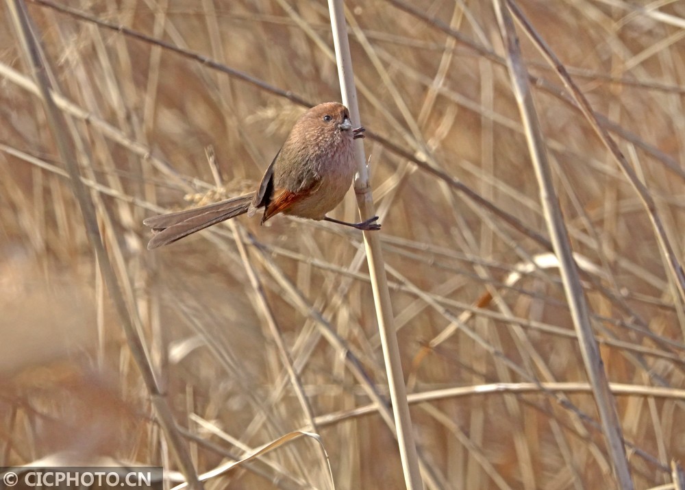 ↑一只震旦鸦雀在芦苇上小憩。CICPHOTO/王希宝 摄