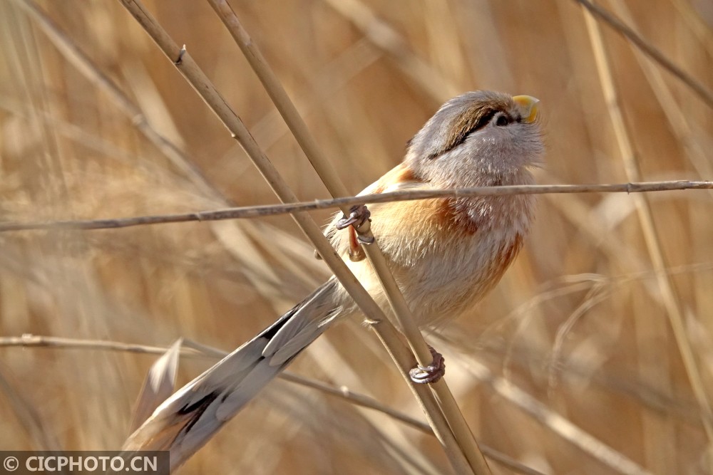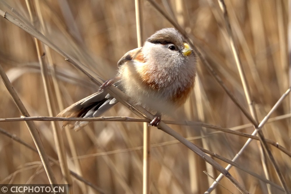 ↑一只棕头鸦雀在芦苇上小憩。CICPHOTO/王希宝 摄