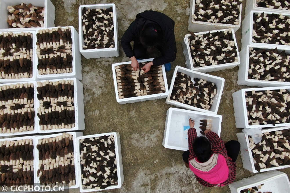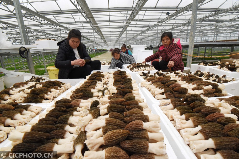 ↑2021年1月27日,村民在贵州省锦屏县隆里乡盛丰农业生态园分选羊肚菌。CICPHOTO/杨晓海 摄