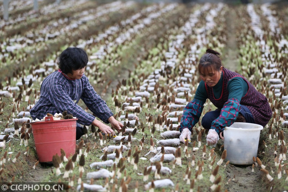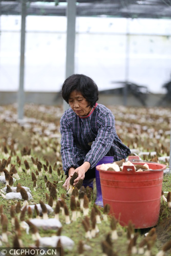 ↑2021年1月27日,村民在贵州省锦屏县隆里乡盛丰农业生态园采摘羊肚菌。CICPHOTO/杨晓海 摄