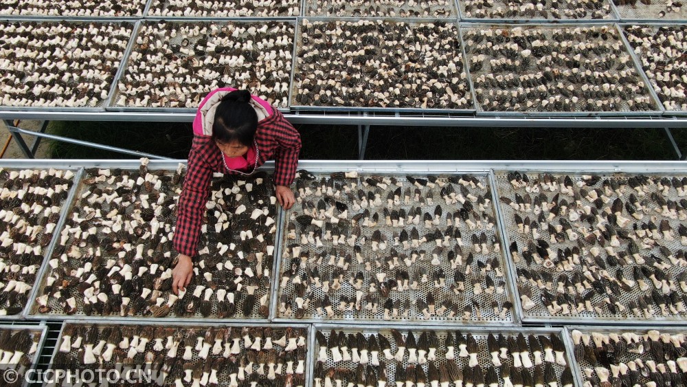 ↑2021年1月27日,村民在贵州省锦屏县隆里乡盛丰农业生态园晾晒羊肚菌(无人机照片)。CICPHOTO/杨晓海 摄