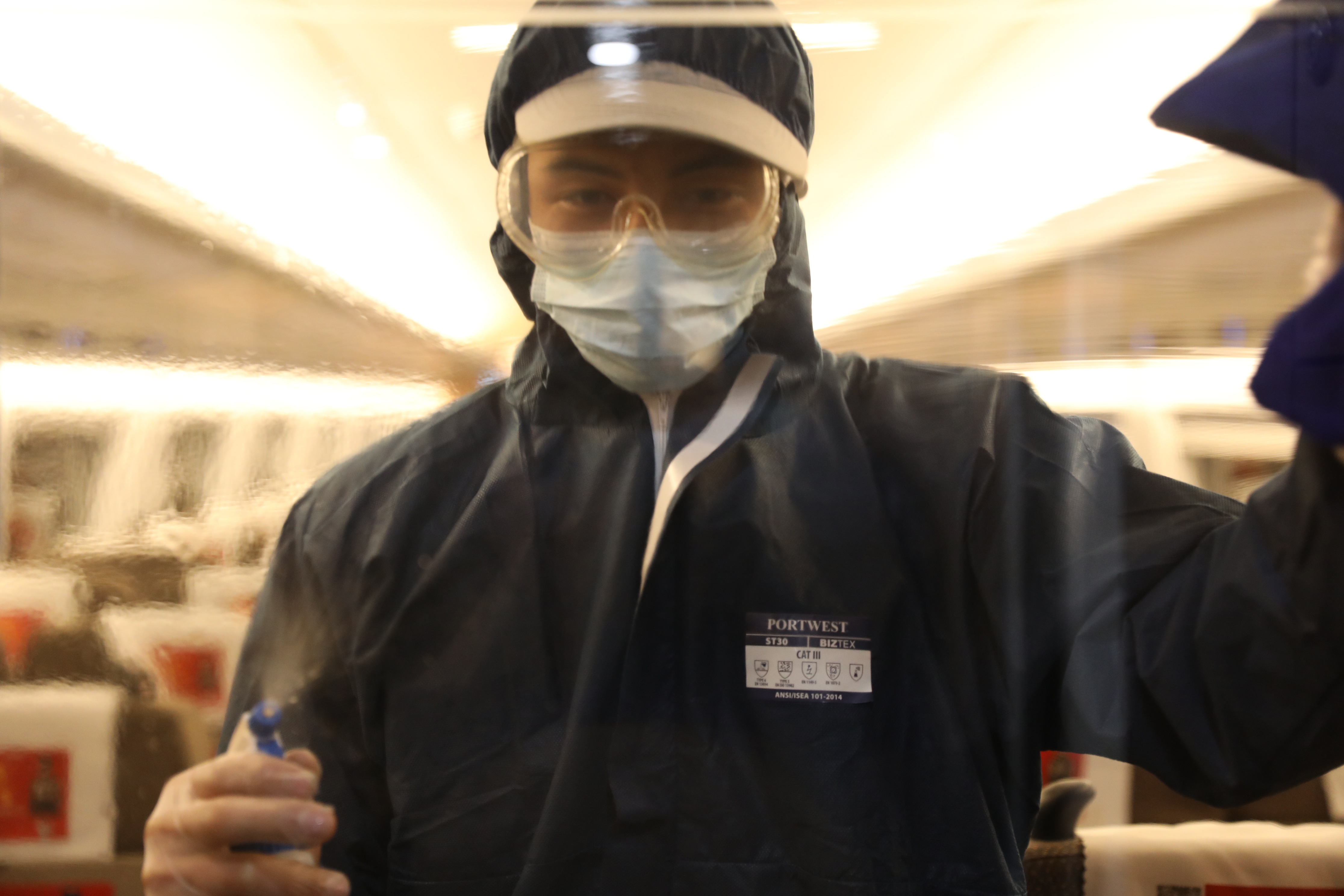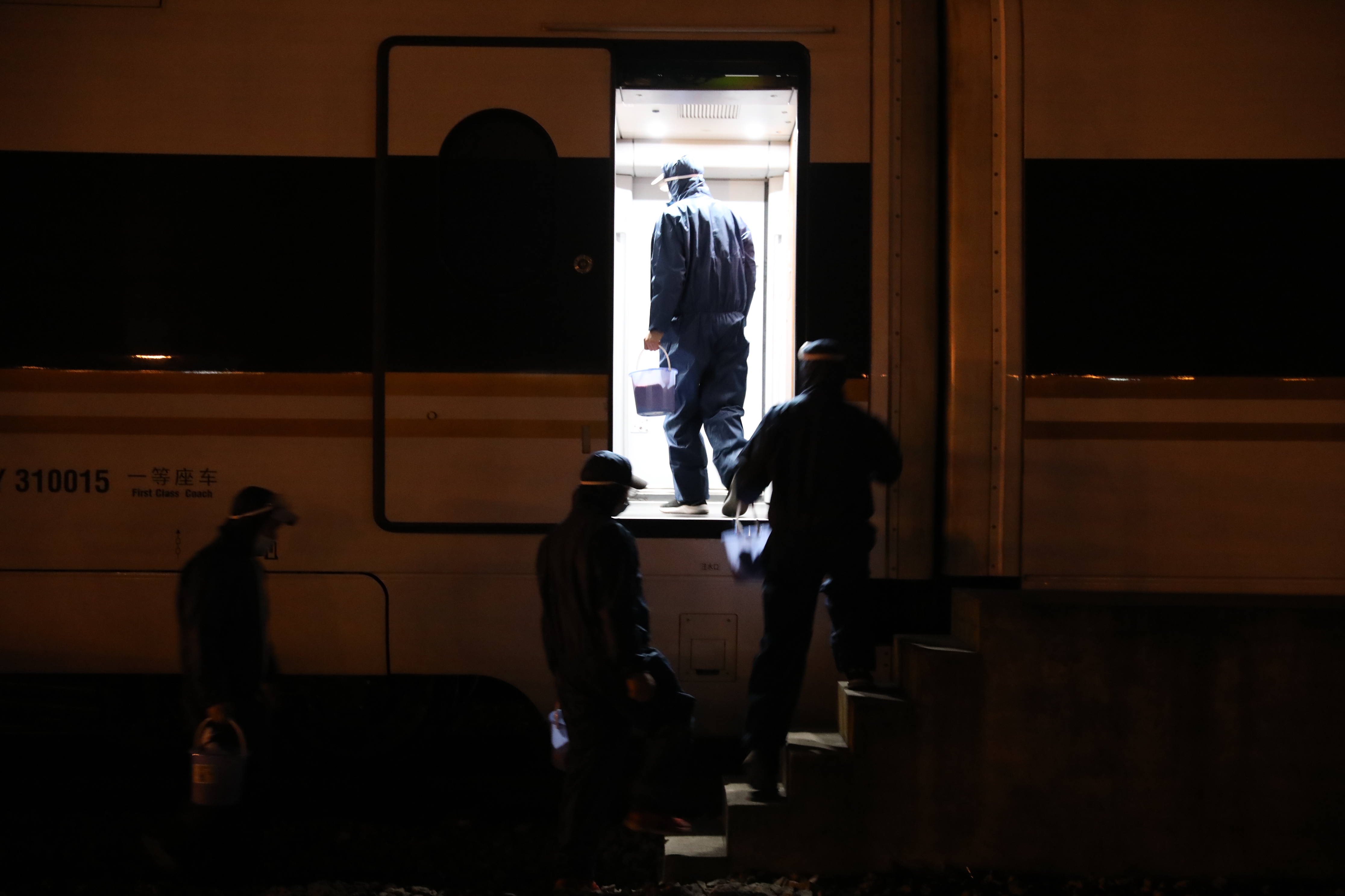 他们被称作“高铁消毒员”,这是因疫情防控需要而增设的岗位。他们一般是从晚上7点工作到第二天早上6点,工作时每个人需要穿防护服、戴防护镜,同时装备一个装有过氧化氢溶液的喷壶、一块抹布和一个水桶,对白天使用过的列车内部各个部位进行消毒。