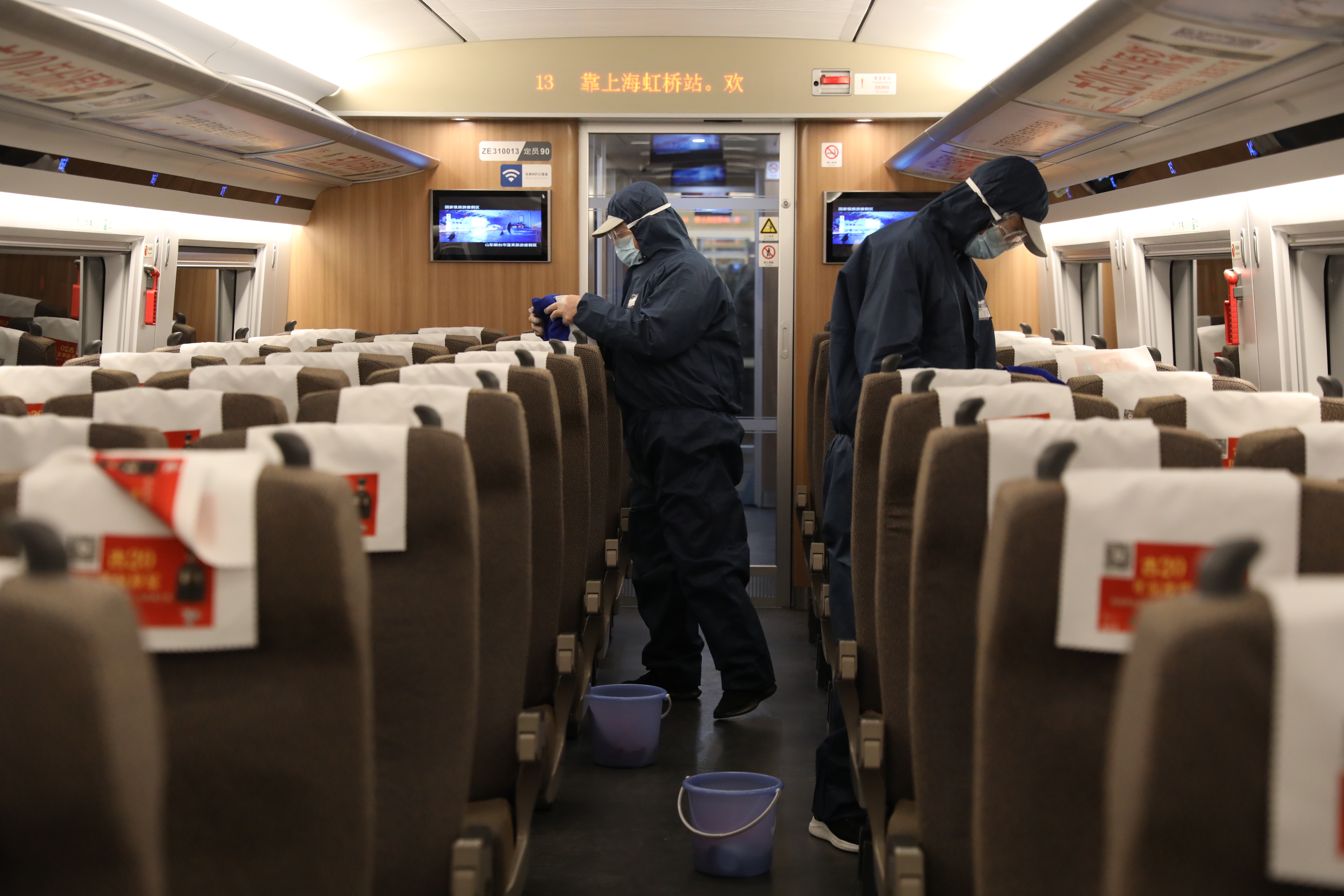 两名消毒员在列车上擦拭座椅。新华社记者 赵逸赫摄