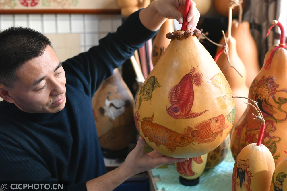 ↑2021年1月28日,山东省青岛市城阳区民间手艺人路好伦在展示自己创作的“连年有余”葫芦烙画。CICPHOTO/王海滨 摄