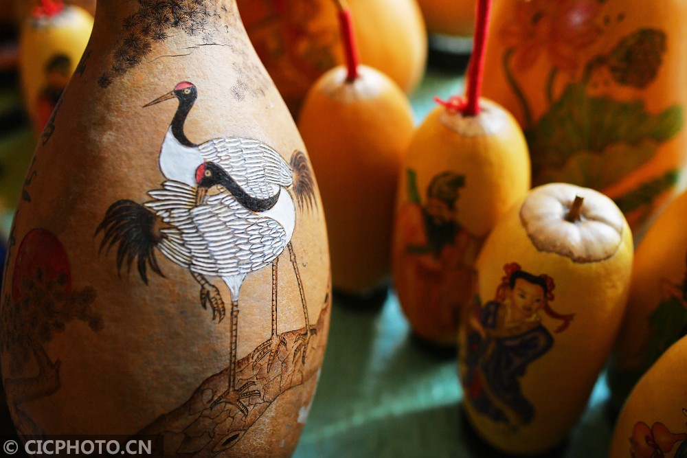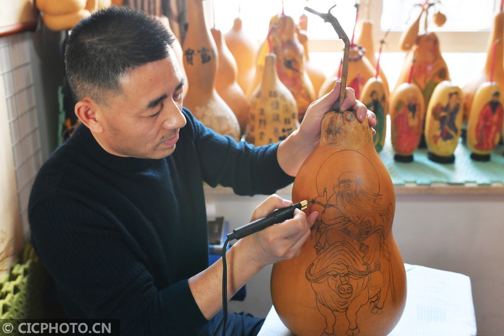 ↑2021年1月28日在山东省青岛市城阳区民间手艺人路好伦工作室拍摄的葫芦烙画。CICPHOTO/王海滨 摄