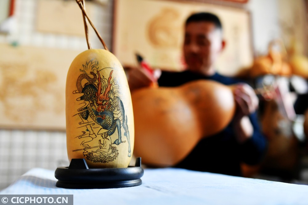 ↑2021年1月28日在山东省青岛市城阳区民间手艺人路好伦工作室拍摄的“龙腾祥瑞”葫芦烙画。CICPHOTO/王海滨 摄