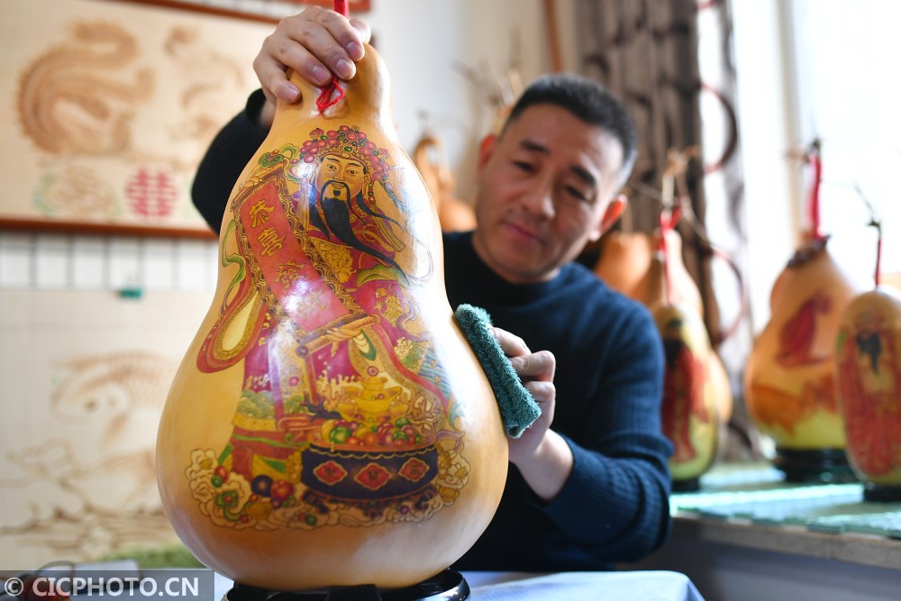 ↑2021年1月28日,山东省青岛市城阳区民间手艺人路好伦在擦拭新近完成的作品“恭喜发财”葫芦烙画。CICPHOTO/王海滨 摄