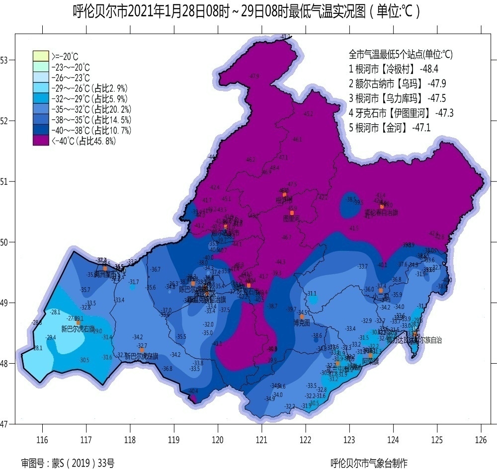另外,额尔古纳市乌玛、根河市乌力库玛、牙克石市图里河、根河市金河的最低气温也在零下47度以下。根据最新预报,呼伦贝尔市较低气温将维持到2月5日。