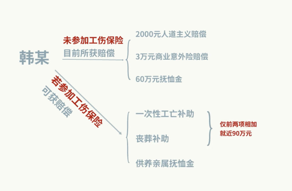 以韩某为例,如果参加了工伤保险,其因工死亡后家属可获得的补偿包括:一次性工亡补助金,标准为上一年度全国城镇居民人均可支配收入的20倍;丧葬补助金,标准为6个月的统筹地区上年度职工月平均工资;另外,其近亲属还可以每月获得一定的供养亲属抚恤金。根据相关标准计算,仅前两项相加就近90万元,大于目前所获得的补偿。
