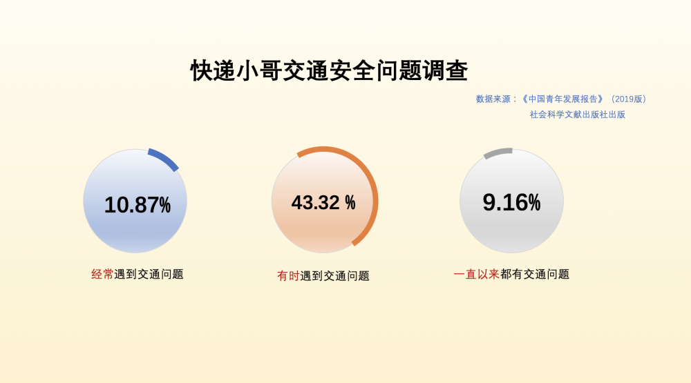 尤其是意外交通风险,一直是外卖骑手、快递员的痛点。社会科学文献出版社出版的《中国青年发展报告》(2019版)显示,在一项有1692份有效样本的调查中,43.32%的快递小哥有时会遇到交通安全问题,10.87%的一直以来都有交通安全问题,9.16%的经常遇到交通安全问题。