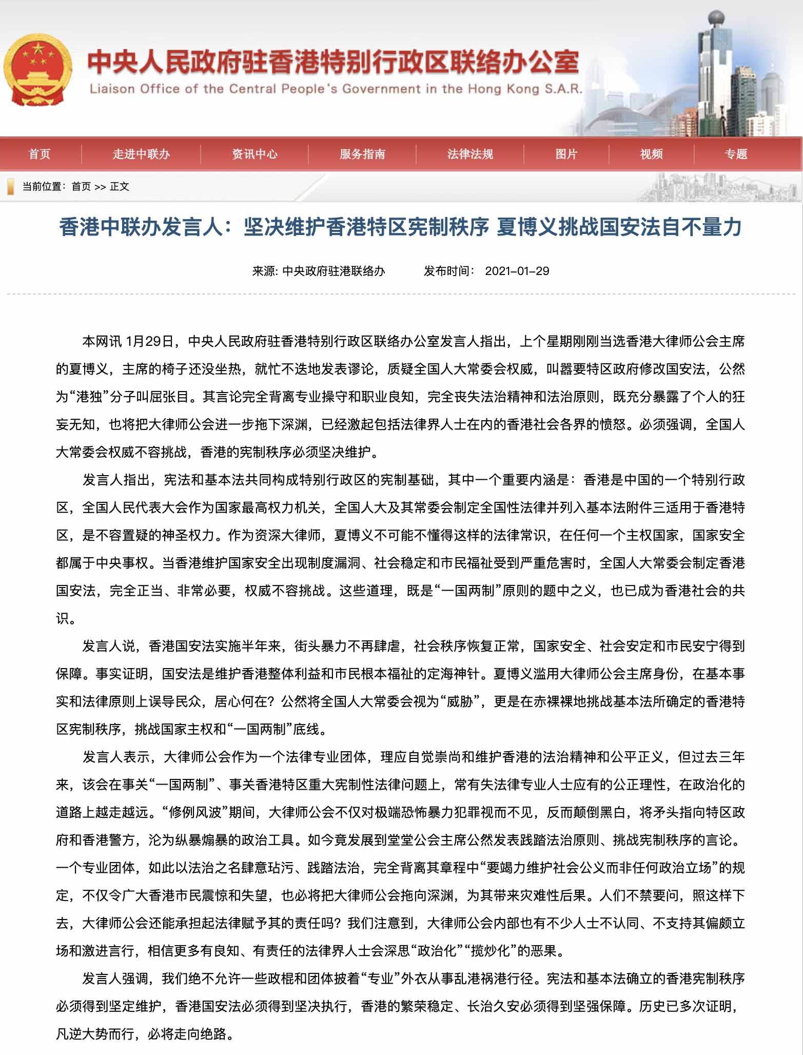 1月29日,中央人民政府驻香港特别行政区联络办公室发言人指出,上个星期刚刚当选香港大律师公会主席的夏博义,主席的椅子还没坐热,就忙不迭地发表谬论,质疑全国人大常委会权威,叫嚣要特区政府修改国安法,公然为“港独”分子叫屈张目。其言论完全背离专业操守和职业良知,完全丧失法治精神和法治原则,既充分暴露了个人的狂妄无知,也将把大律师公会进一步拖下深渊,已经激起包括法律界人士在内的香港社会各界的愤怒。必须强调,全国人大常委会权威不容挑战,香港的宪制秩序必须坚决维护。