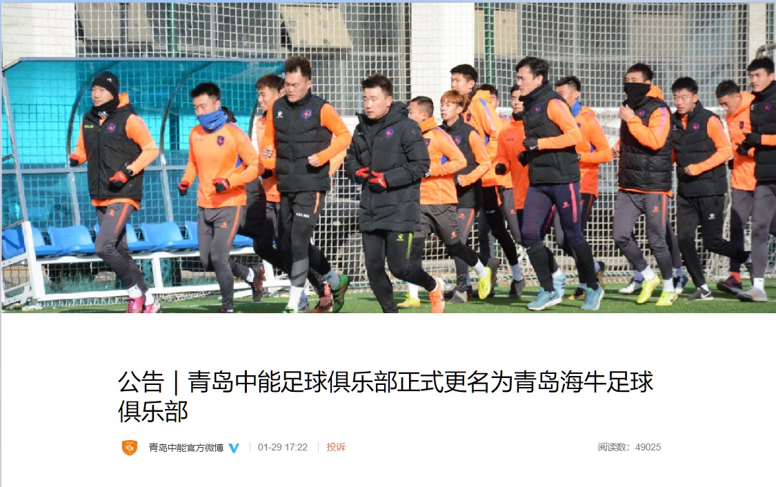 在广泛听取球迷等社会各界意见基础上,经俱乐部董事会慎重研究,并报请工商部门和中国足协核准,自2021年1月21日起,“青岛中能足球俱乐部有限公司”正式更名为“青岛海牛足球俱乐部有限公司”。