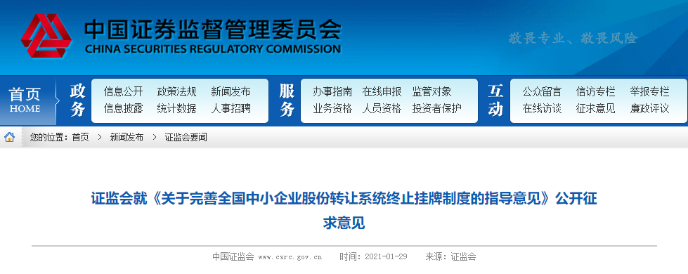 为建立常态化、市场化的退出机制,形成“有进有出”的良性市场生态,提升新三板市场活力和挂牌公司质量,依据《公司法》《证券法》《国务院关于全国中小企业股份转让系统有关问题的决定》(国发〔2013〕49号)《非上市公众公司监督管理办法》(证监会令第161号)等有关规定,证监会起草了《关于完善全国中小企业股份转让系统终止挂牌制度的指导意见》(以下简称《指导意见》),现向社会公开征求意见。