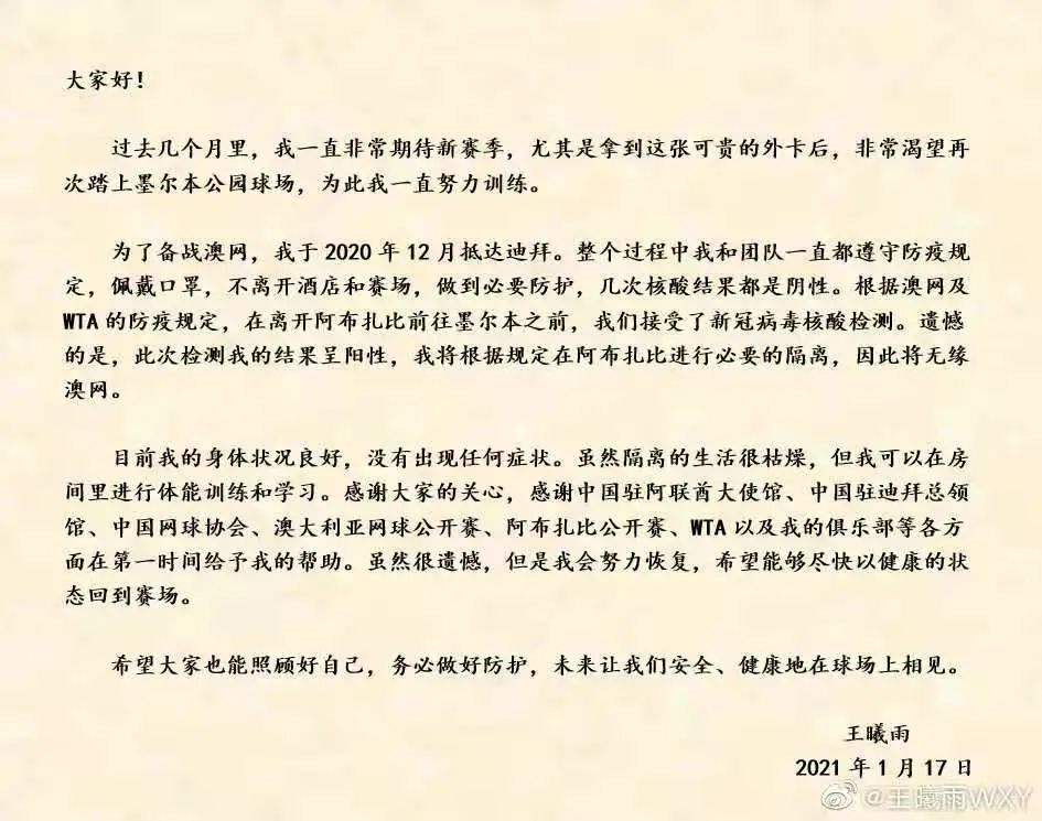 获得正赛外卡的中国球员王曦雨在登机前因核酸阳性,无奈退赛