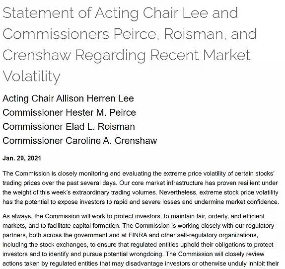美国证券交易委员会表示,将一如既往地保护投资者,维持公平、有序和有效的市场,“如果有证据表明出现了联邦证券法律所禁止的滥用或操纵交易行为的做法,我们将采取行动保护散户投资者。”