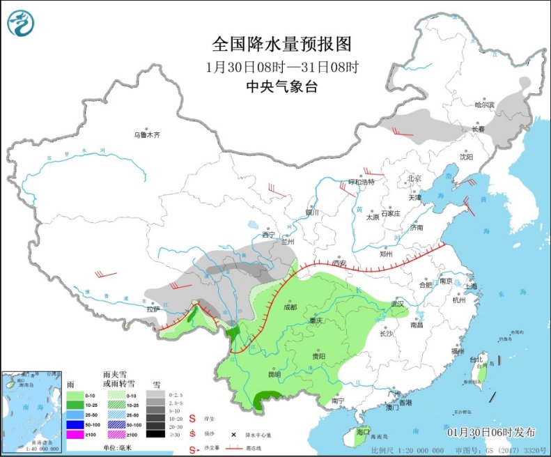 今天(30日),内蒙古中东部、东北地区东部、西藏南部和东部、西北地区中南部、川西高原等地部分地区有小雪或雨夹雪,局部有中雪。西南地区大部、江南西部、华南西部等地部分地区有小雨,局部有中雨。