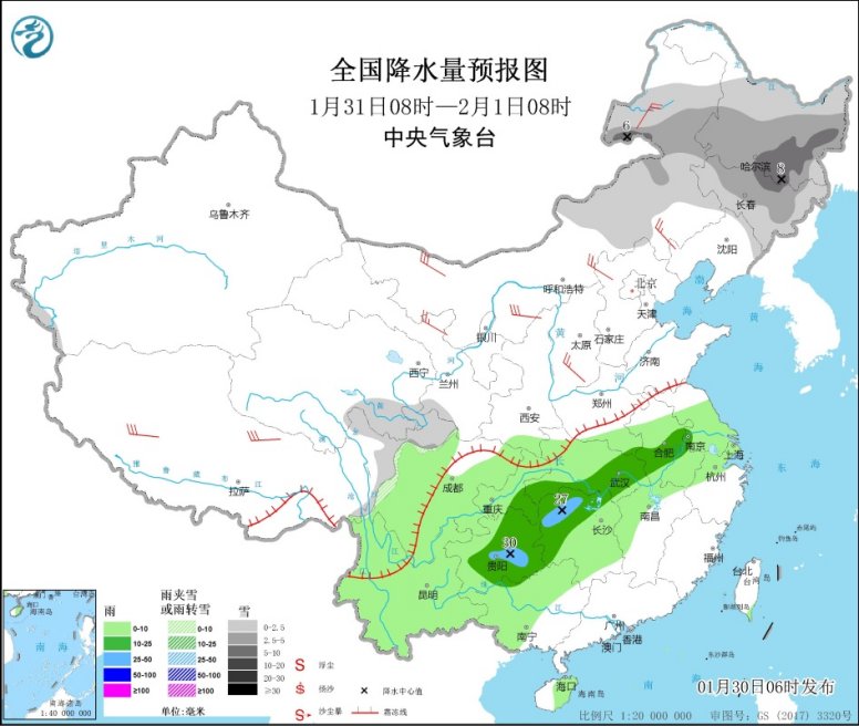 明天(31日),内蒙古东部、东北地区大部、川西高原北部等地部分地区有小雪或雨夹雪,其中,内蒙古东北部、东北地区中部等地部分地区有中到大雪。江淮大部、江汉、江南北部和西部、西南地区大部、华南西部等地部分地区有小到中雨,其中,贵州中南部、湖南西北部等地部分地区有大雨。