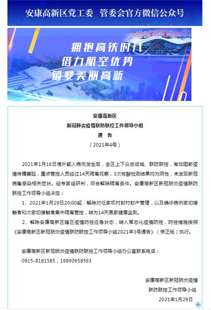 1月29日,陕西省安康高新区新冠肺炎疫情联防联控工作领导小组发布通告,解除安康高新区辖区疫情防控应急状态,转入常态化疫情防控。1月29日20时起,解除对任家坝村封村封户管理,以及确诊病例密切接触者和次密切接触者集中隔离管控,转为14天居家健康监测。(总台央视记者 杨永青 孟涛)