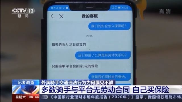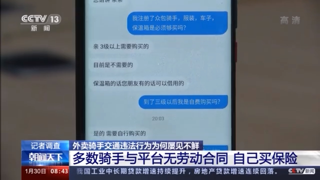 记者随后拨打了多个外卖平台客服电话,这些平台客服称:众包骑手服装、保温箱、交通工具都需自行解决。与平台关系以“服务合作协议”为准,不是劳动关系,不签劳动合同。