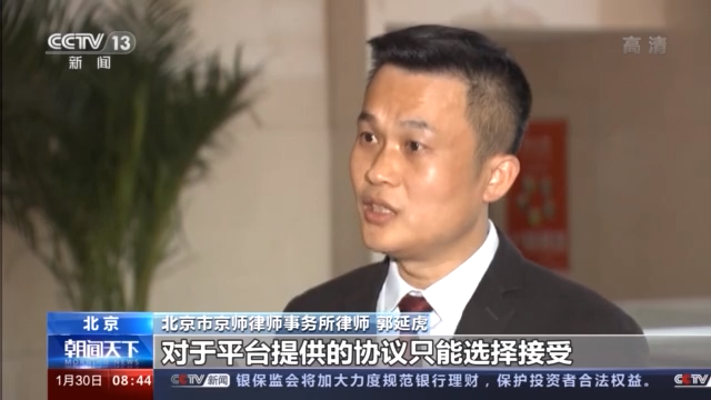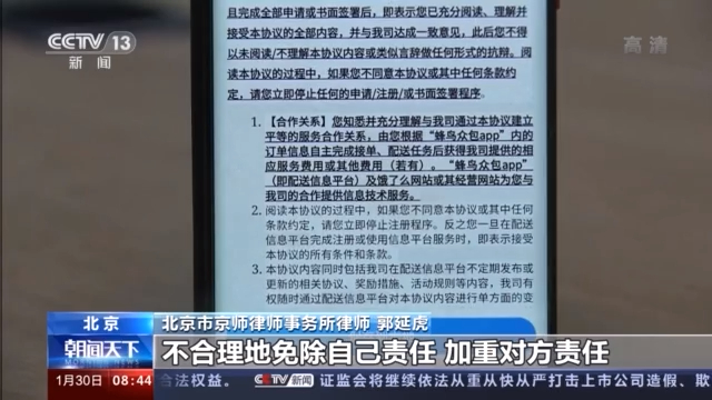北京市京师律师事务所律师 郭延虎:骑手在APP上注册账户时对于平台提供的格式协议只能点击“接受”才能注册成功,而对于协议的内容是没有修改和谈判余地的。根据法律规定:提供格式条款一方不合理的免除自己责任、加重对方责任、排除对方主要权利的,该条款无效。