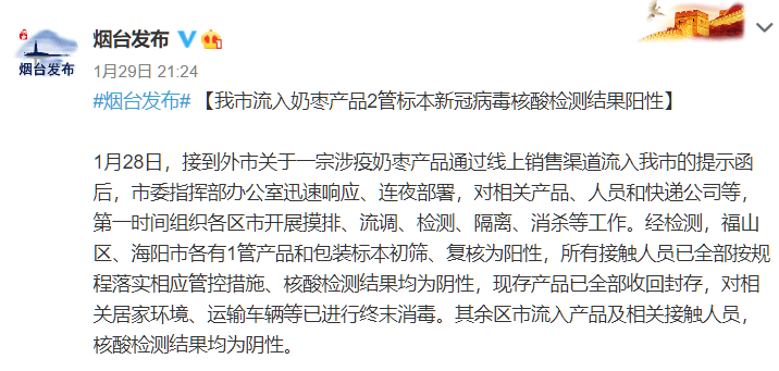 1月28日,烟台市接到外市关于一宗涉疫奶枣产品通过线上销售渠道流入烟台市的提示函后,烟台市委指挥部办公室对相关产品、人员和快递公司等,第一时间开展摸排、流调、检测、隔离、消杀等工作。经检测,烟台市福山区、海阳市各有1管产品和包装标本初筛、复核为阳性,所有接触人员已全部按规程落实相应管控措施、核酸检测结果均为阴性,现存产品已全部收回封存,对相关居家环境、运输车辆等已进行终末消毒。其余区市流入产品及相关接触人员,核酸检测结果均为阴性。