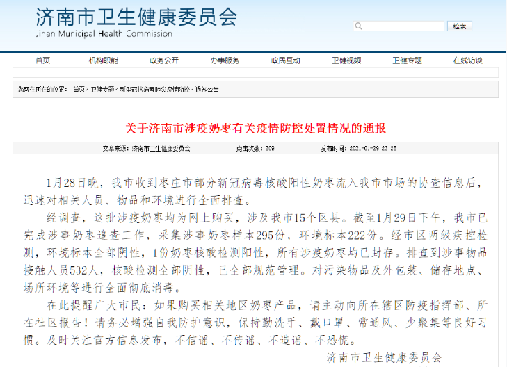 1月29日,山东省济南市卫健委发布通报,1月28日晚,济南市收到枣庄市部分新冠病毒核酸阳性奶枣流入济南市市场的协查信息后,迅速对相关人员、物品和环境进行全面排查。