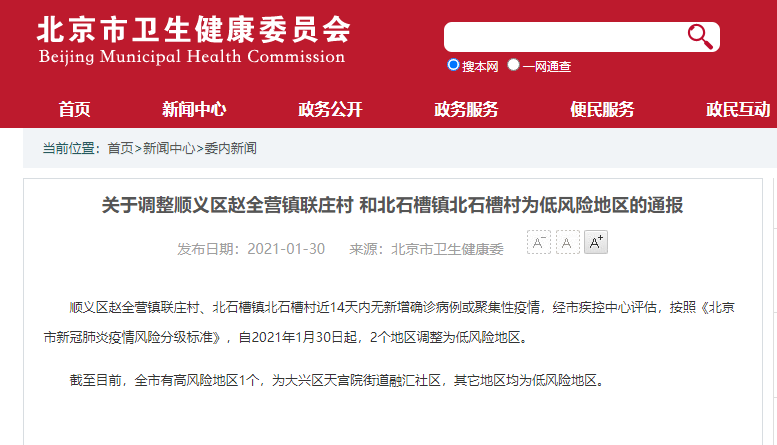 北京市顺义区赵全营镇联庄村、北石槽镇北石槽村近14天内无新增确诊病例或聚集性疫情,经市疾控中心评估,按照《北京市新冠肺炎疫情风险分级标准》,自2021年1月30日起,2个地区调整为低风险地区。