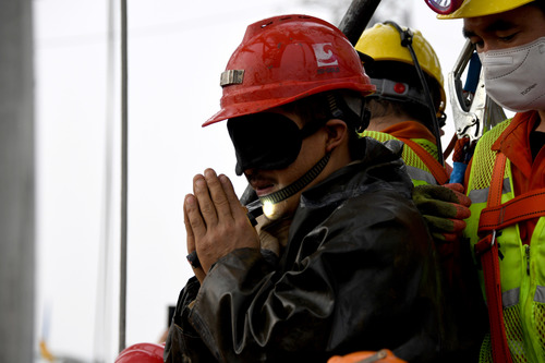 王海龙最后一批升井。当时他戴着黑色眼罩,恰好面朝现场等待的人群。他双手合十表示感谢。握在手心里的手电筒还开着,光线打在他的脸上。