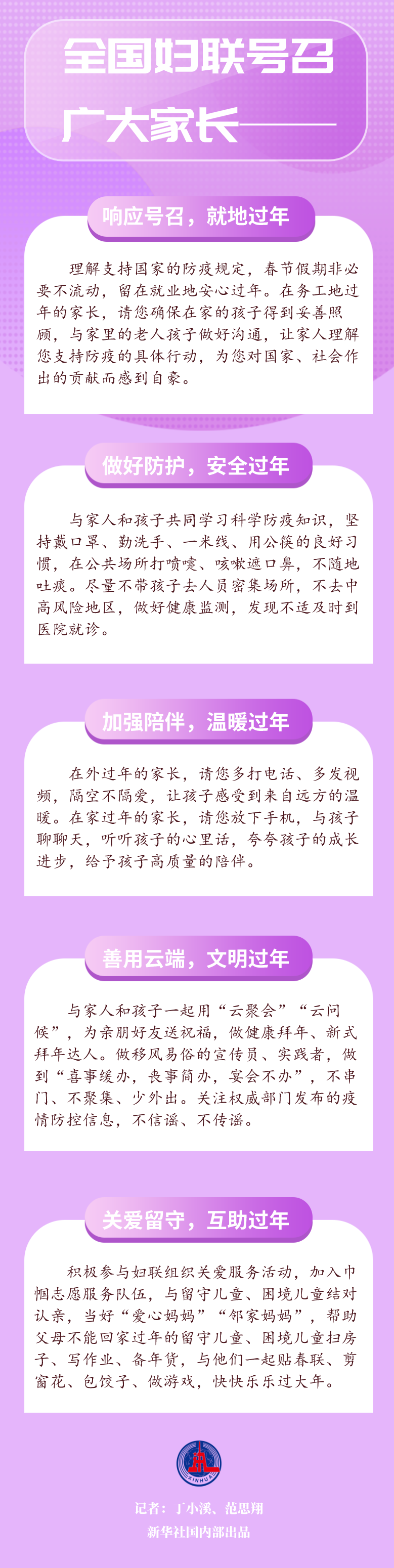 就地过年踏实又安心、“云聚会”隔空不隔爱、放下手机陪娃开心过年……全国妇联近日发出《大手拉小手 共度平安年——致广大家长的倡议书》,号召广大家长从我做起,从家庭做起,用实际行动贡献防疫“家力量”,和孩子共度健康平安、温暖有爱的中国年。详情请看↓