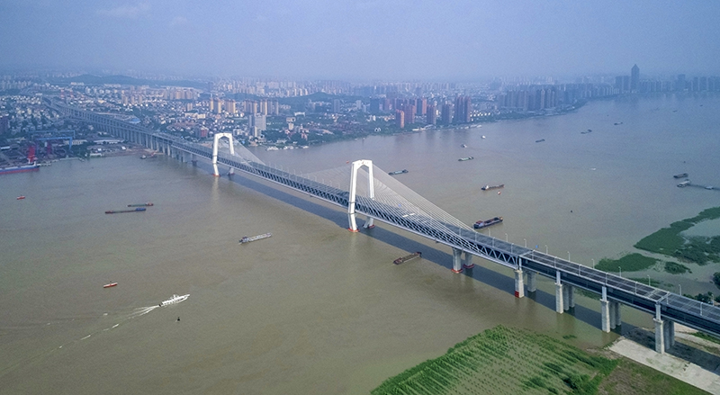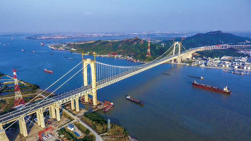 沪苏通长江公铁大桥是世界最大跨度公铁两用斜拉桥。大桥北起南通,南至张家港,主跨1092米,是高速公路、客货混线铁路和高速铁路“三合一”的过江通道。