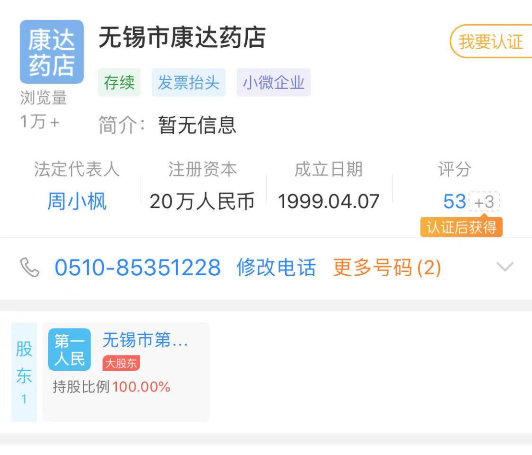 总台央广记者在“天眼查”查询看到,无锡市康达药店成立于1999年4月,股东是无锡市第一人民医院,持股比例100%。无锡市第一人民医院已经在2007年与儿童医院等整建制组合,成立了无锡市人民医院。