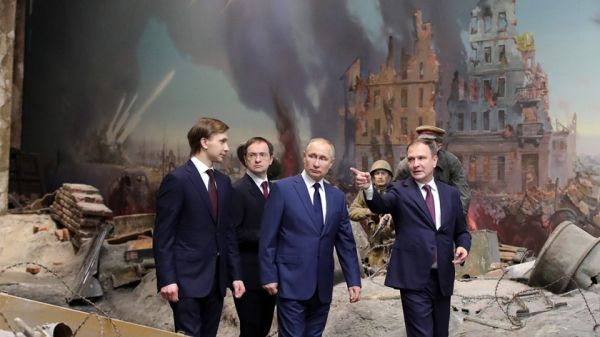 27日,普京(右二)在莫斯科参观胜利博物馆,当天是列宁格勒保卫战胜利77周年纪念日。(法新社)