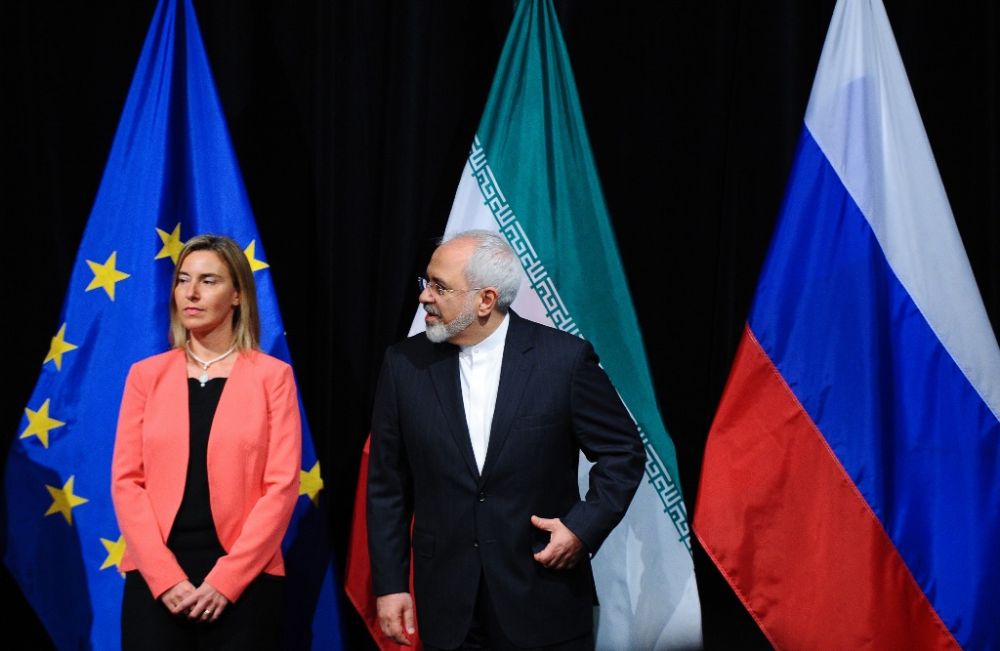 2015年7月14日,奥地利维也纳,时任欧盟外交和安全政策高级代表费代丽卡·莫盖里尼与伊朗外长穆罕默德·贾瓦德·扎里夫参加集体合影。美国、英国、法国、俄罗斯、中国和德国当天与伊朗达成伊核协议。(新华社记者钱一摄)