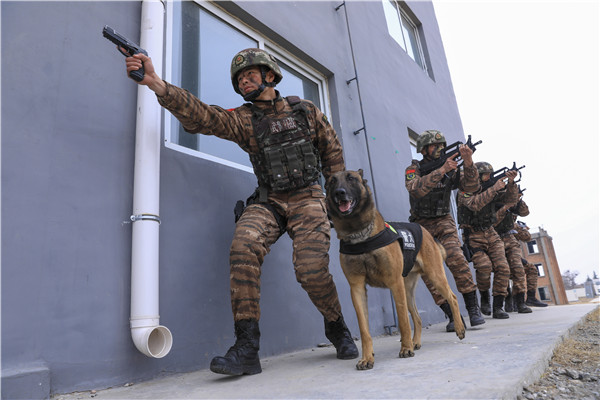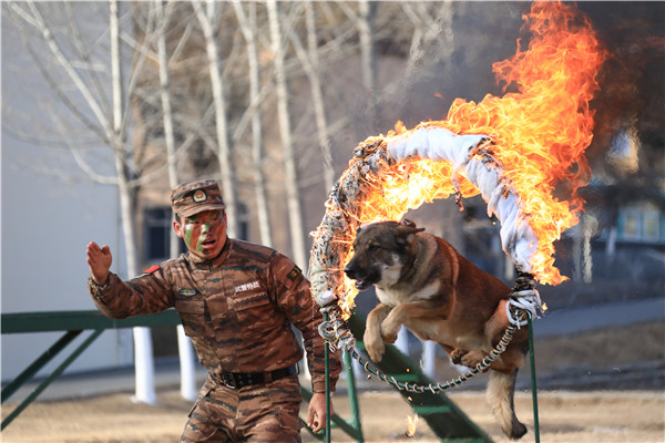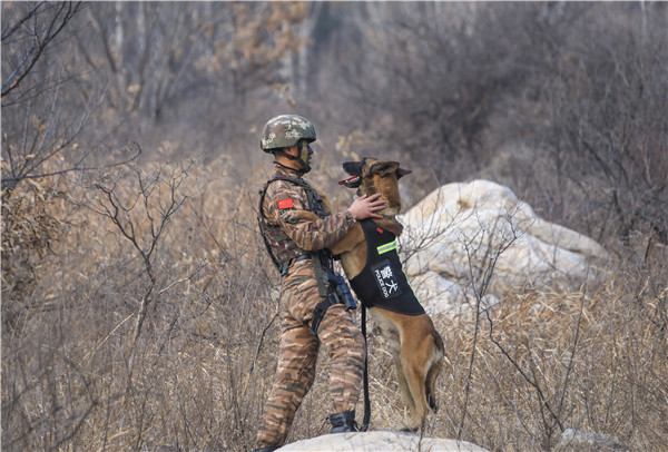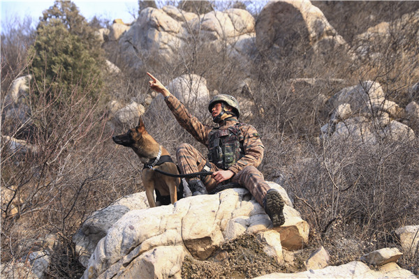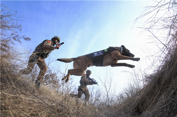 警犬“雷豹”和侦察队员快速跨越壕沟