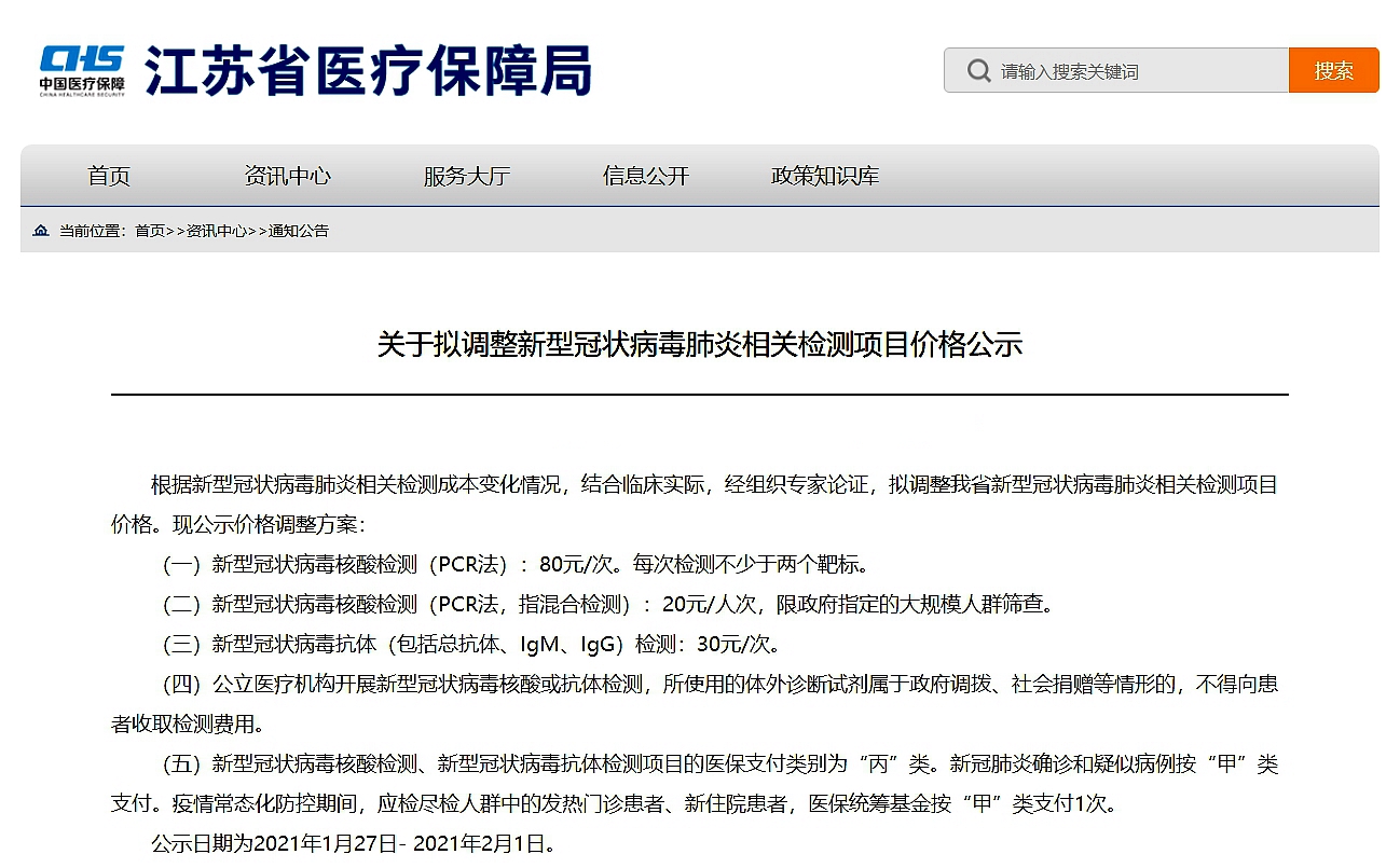 近日,江苏省医疗保障局公布了《关于拟调整新型冠状病毒肺炎相关检测项目价格公示》,公示期为2021年1月27日—2月1日。
