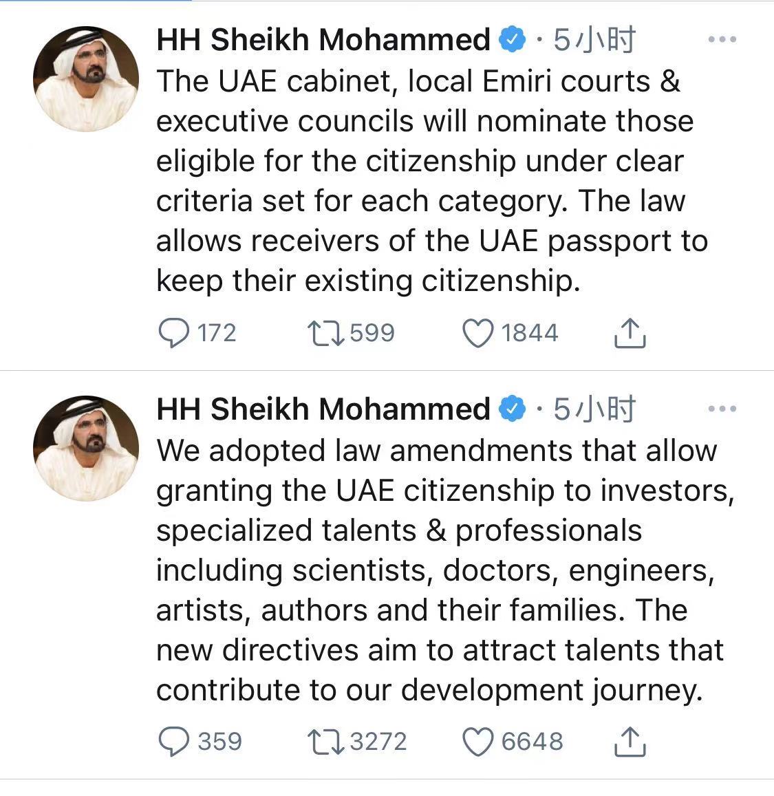 据阿联酋官方通讯社消息,当地时间30日,阿联酋政府通过一项重大修正案,将给予符合条件的外国投资者、科学家和医生等专业人士及他们的家属阿联酋公民权,并允许获得阿联酋护照的外国人,继续保留他们本国的公民权。这被视为阿联酋当局在其公民权相关法律领域的重大变革,此前阿联酋不认可双国籍。据报道,阿联酋副总统兼总理、迪拜酋长穆罕穆德当天在个人社交媒体上宣布了这一决定,并表示阿联酋内阁、地方法院和执行委员会将根据各个类别设定明确的准则,以便提名有资格获得公民资格的人。他同时表示该法案的推出旨在为阿联酋未来的发展吸引人才。