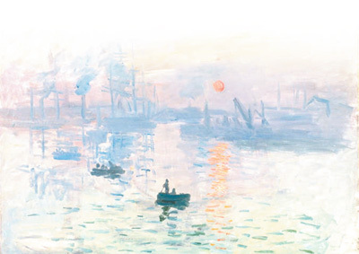 1874年,莫奈、毕沙罗、西斯莱、雷诺阿、德加等人决定联合发起画展。“无名画家、雕塑家、版画家协会”成立,并在摄影家纳达尔的工作室举行首展。在莫奈提交的几幅作品中,恰有他最负盛名的作品之一《日出·印象》:日出时分,海上起了雾。隐隐约约可见船只的灰蓝色身影。勒阿弗尔港口仍在酣睡,暖橘色的阳光已经穿云破雾泼洒在海面上,期待将人们唤醒。画面上没有清晰的轮廓线,只有朦胧的色块。海面的蓝和日出的红,仿佛一半海水一半火焰。