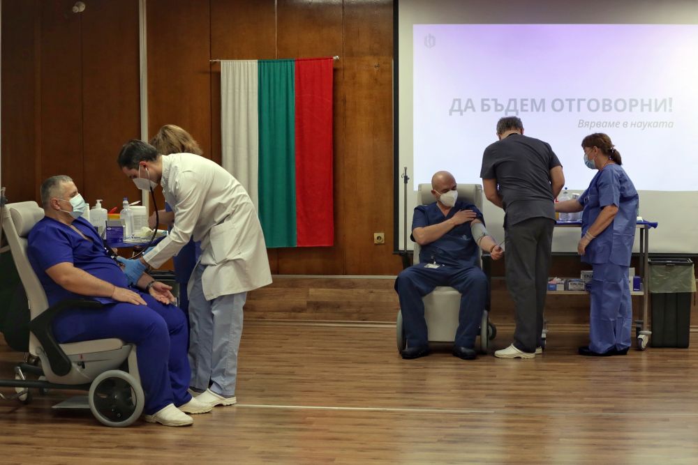 2020年12月27日,在保加利亚首都索非亚一家医院,医护人员接受新冠疫苗接种。(新华社发)