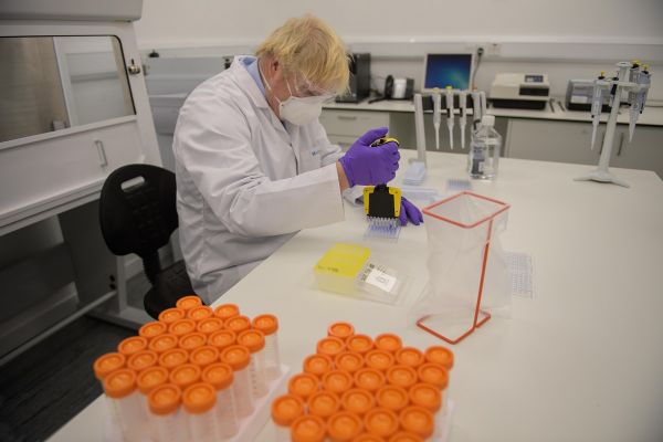 1月28日,英国首相约翰逊参观了位于苏格兰西部利文斯顿的法国瓦尔内瓦生物技术实验室,并尝试动手做实验。该实验室准备开始大规模生产一种新冠疫苗。(法新社)